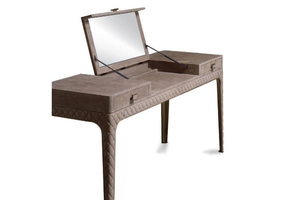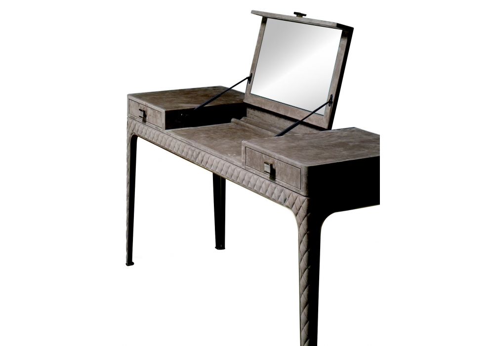 Susanne von Rugiano entworfen, ist ein mit Leder bezogener Schminktisch mit Klappe, Spiegel und zwei Schubladen. Details in Stahl oder Bronze.
