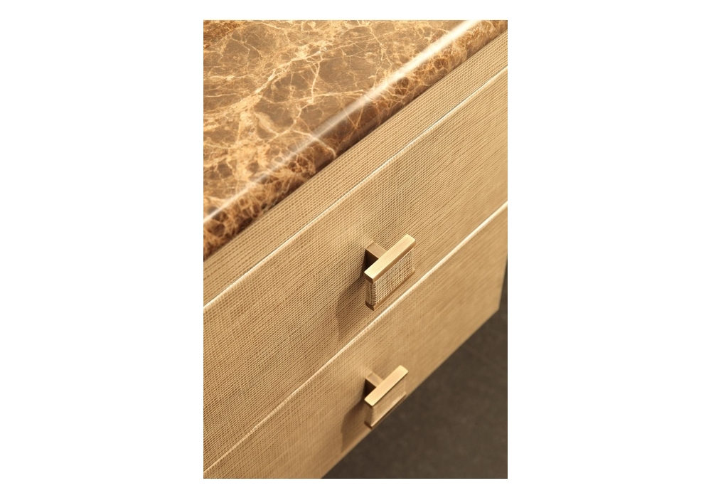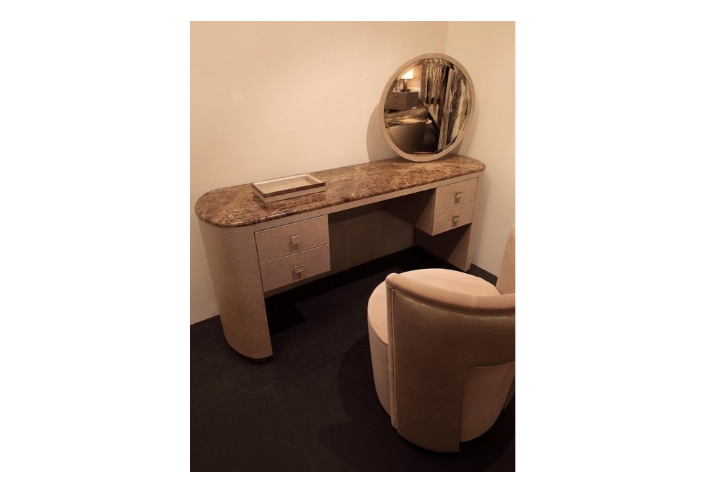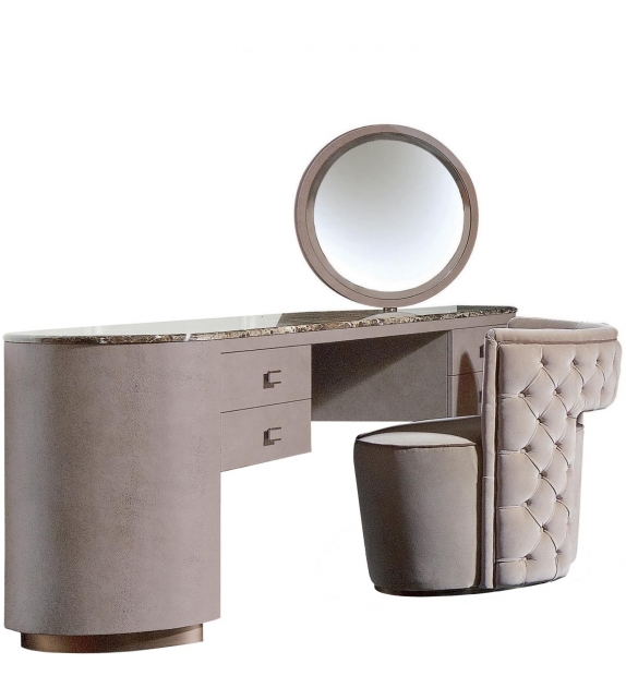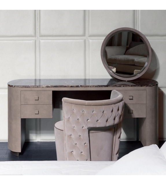 Damassè von Rugiano entworfen, ist ein mit Leder bezogener Schminktisch mit vier Schubladen und Marmorplatte. Einzelheiten in Bronze.