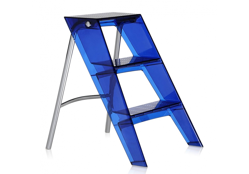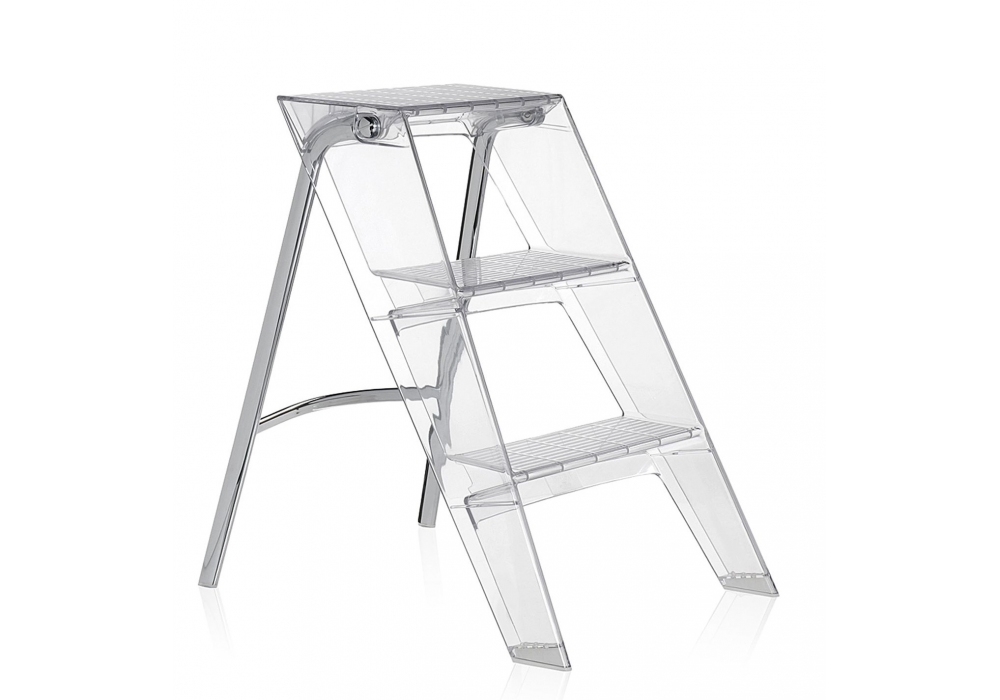 Upper von Alberto Meda & Paolo Rizzatto für Kartell entworfen, ist eine Leiter mit einer Struktur aus verchromtem Stahl und Stufen aus Polycarbonat 2.0 aus transparentem oder durchgefärbtem nachwachsendem Rohstoff.