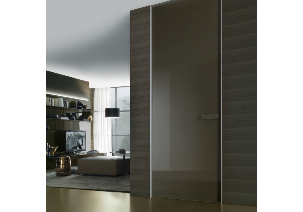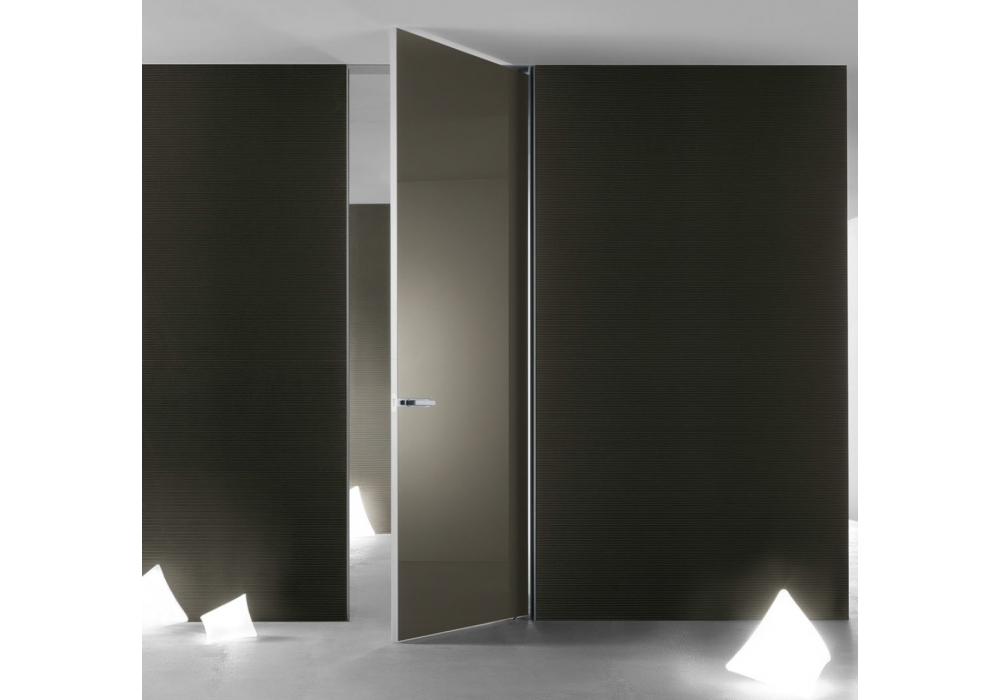 Aura von Giuseppe Bavuso ist eine neue Phase des Projekts Rimadesio Innentüren. Die Idee einer lackierten Glasoberfläche, die sich immer zusammen mit den Wänden, durch einem Aluminium Kontur Mindestdicke verschmelzet. Aura ist beidseitig, mit Pendeloeffnung und patentierter Magnet-Verschluss, vollständig unsichtbar, ohne Verwendung von traditionellen sperren.