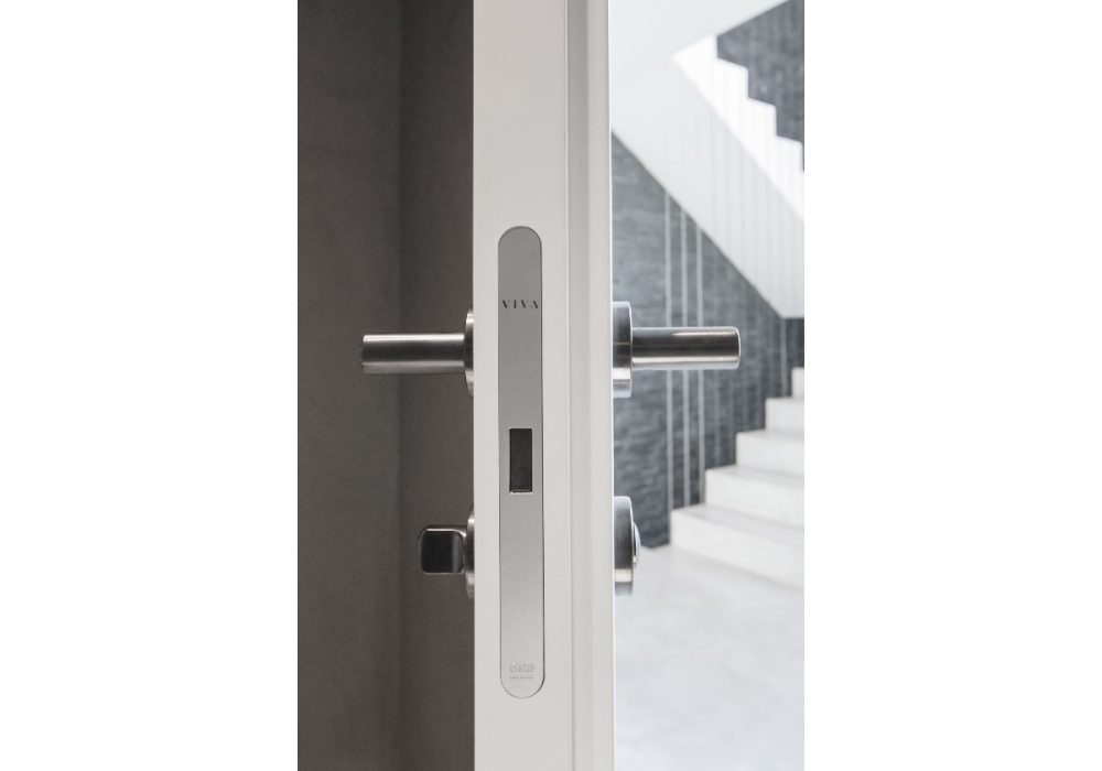 V0 Grafica von Viva entworfen, ist eine Innentür, die bündig mit der Wand ist, auf der Zugseite oder auf der Druckseite, mit Scharnier, komplett mit Aluminiumtür und -rahmen. Matter oder glänzender Lack. Erhältlich in verschiedenen Ausführungen und Ausführungen.