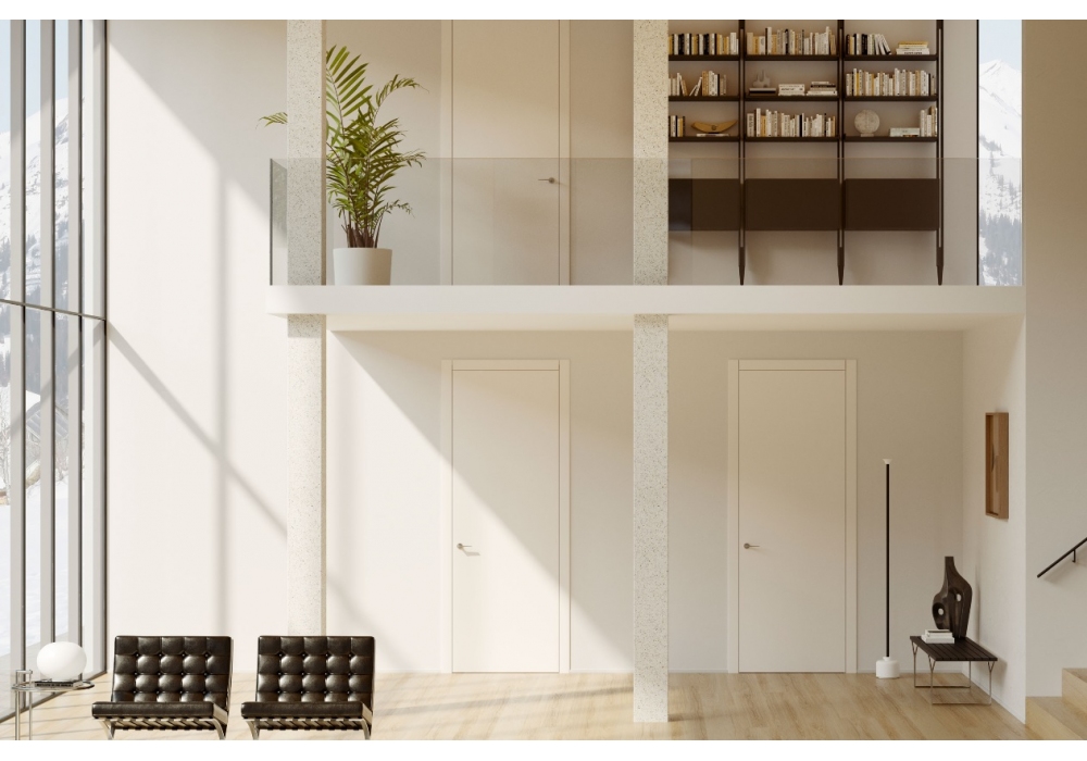 V2 von Viva entworfen, ist eine Pendeltür komplett mit Tür, Pfosten und Zargen. Glänzender oder matter Lack. Erhältlich in verschiedenen Ausführungen und Ausführungen.