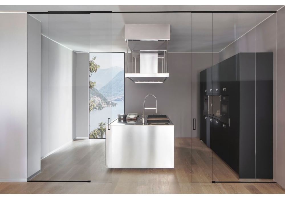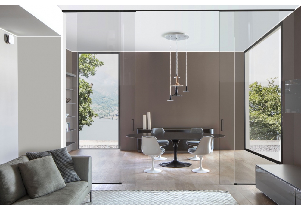 Cernobbio von Viva entworfen, ist eine Glasschiebetür, mit Tür und Schiene inklusive. Erhältlich in verschiedenen Ausführungen.