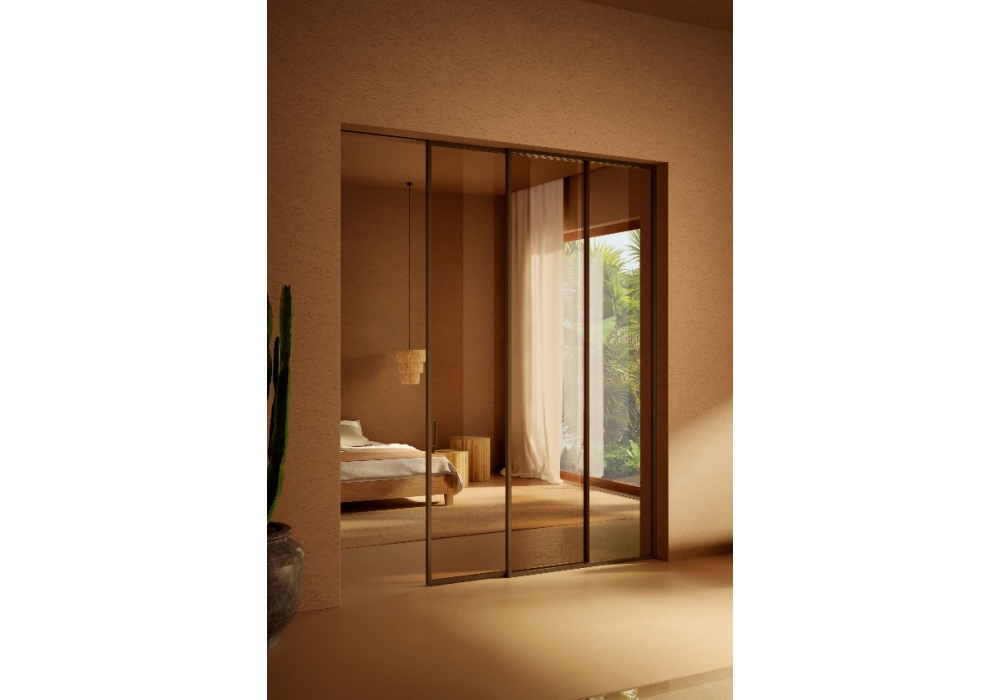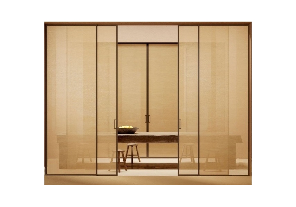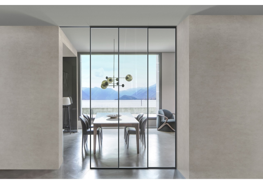 Bellagio von Viva entworfen, ist eine Schiebetür aus Glas oder mit Stoffbespannung. Aluminiumrahmen. Erhältlich in verschiedenen Ausführungen.