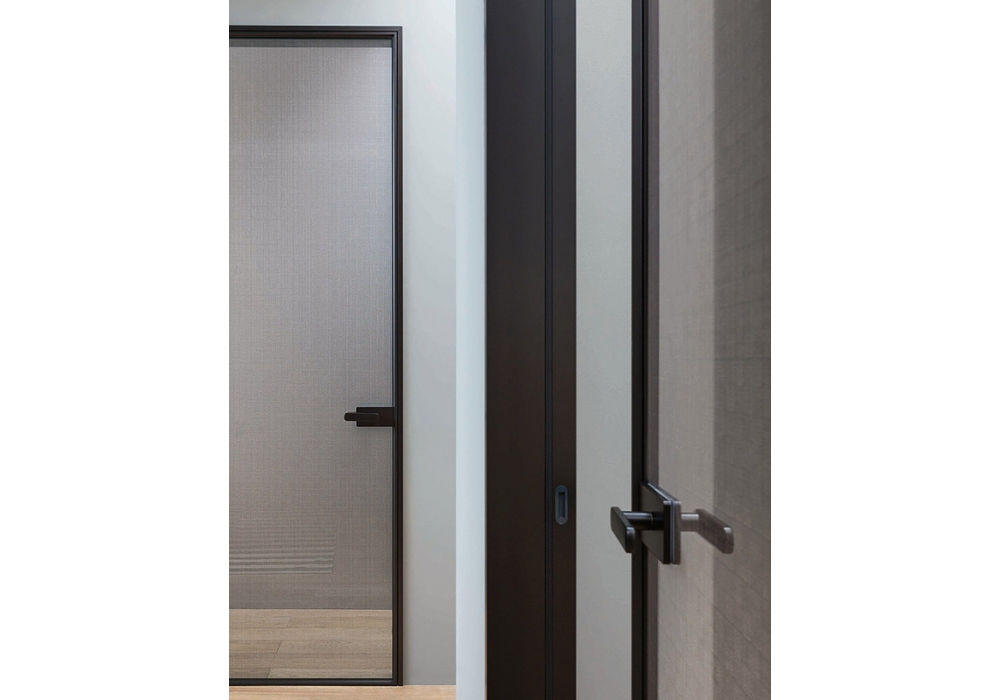 L7 von Piero Lissoni für Lualdi entworfen, ist eine Designtür mit Holz- oder Glastür und Aluminiumpfosten. Erhältlich in verschiedenen Ausführungen.