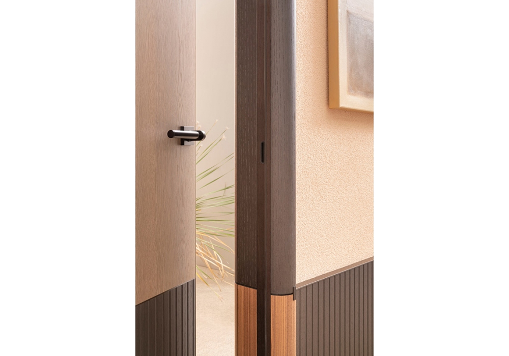 Ying, von Steve Leung für Lualdi entworfen, ist eine Innentür mit Holzpfosten, der untere Teil des Rahmens ist das Ergebnis eines Holzbearbeitungsprozesses, der von der traditionellen chinesischen Technik inspiriert ist, und zeichnet sich durch eine Oberfläche mit geometrischen Schnitzereien aus, die die beiden seitlichen Einsätze verstärkt. Der obere Teil der Tür betont dann die Flexibilität des Designs und die Fähigkeit, sich an unterschiedliche Innenraumkontexte anzupassen. Erhältlich in verschiedenen Ausführungen.