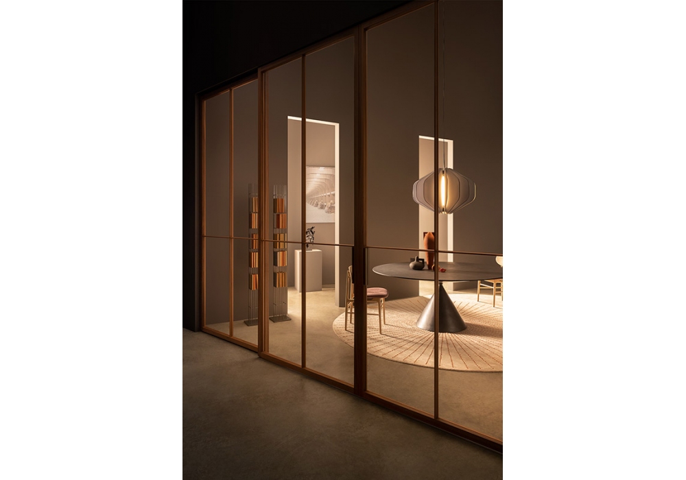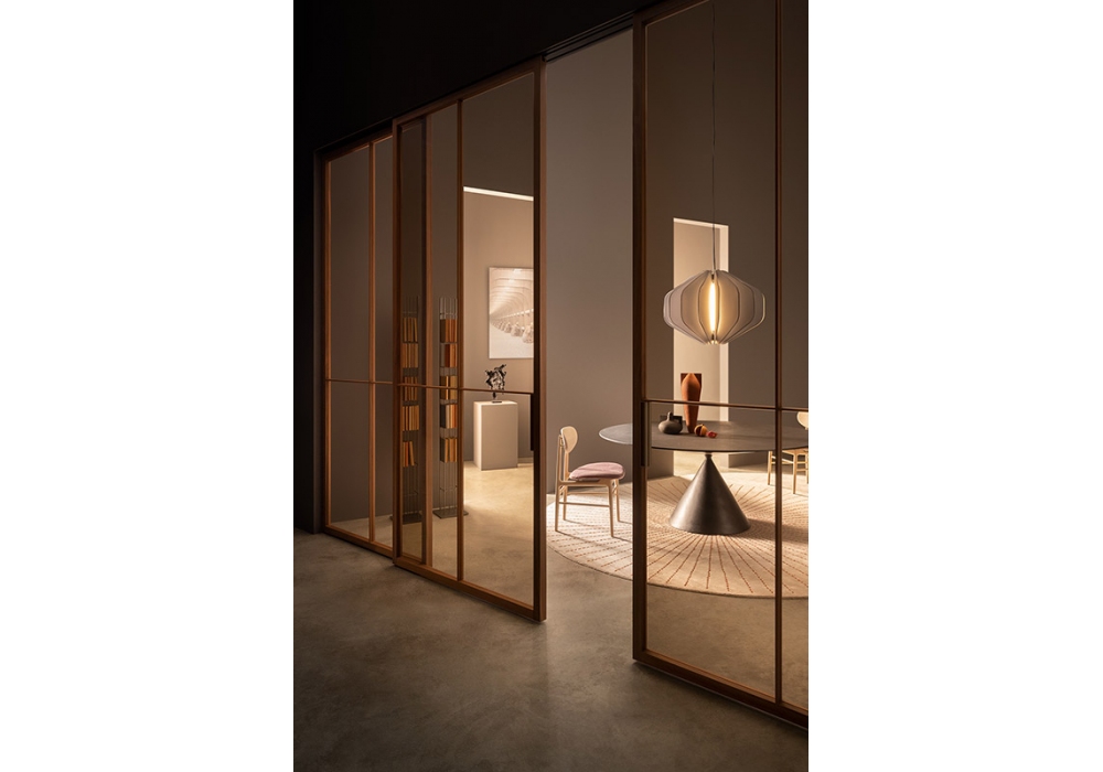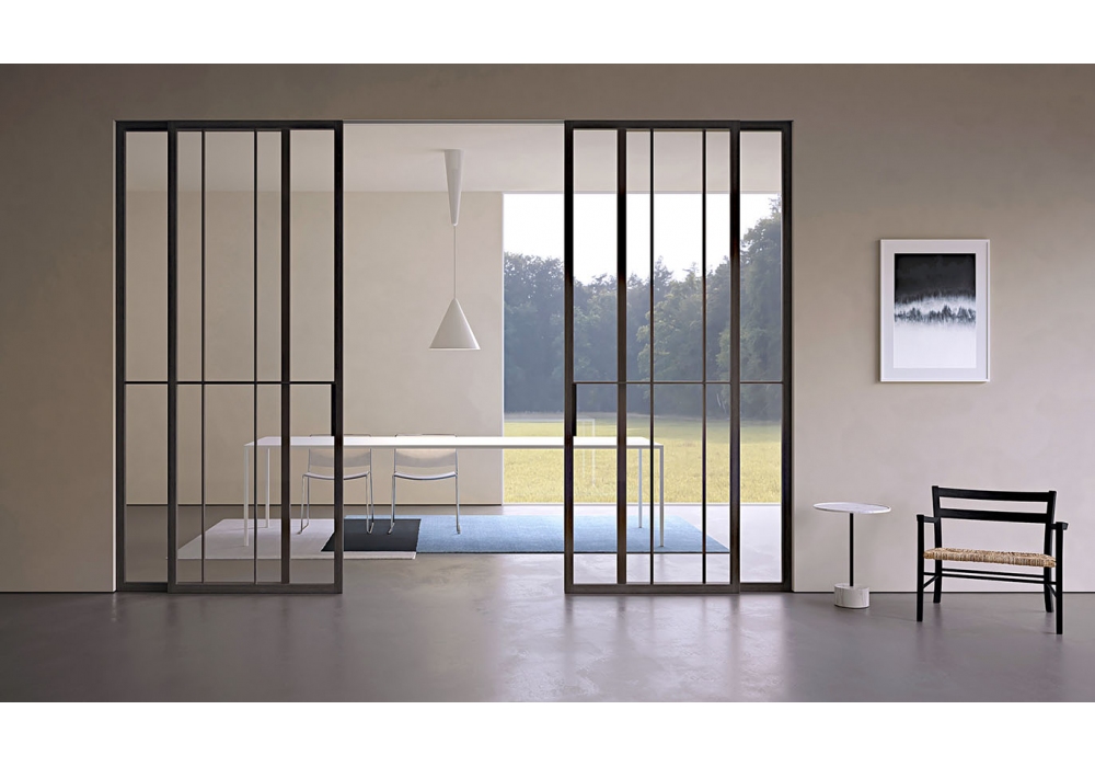 Skye, von Piero Lissoni für Lualdi entworfen, ist eine Tür mit einem System aus festen und verschiebbaren Paneelen aus Holz und Glas. Erhältlich in verschiedenen Ausführungen.