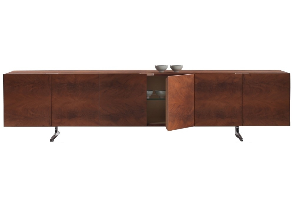 Piuma von Antonio Citterio für Flexform entworfen, ist ein TV-Ständer mit Holzstruktur, Glasregalen und Aluminiumfüßen. Verfügbar in verschiedenen Ausführungen.