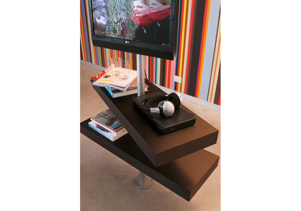 Domino TV von T. Colzani für Porada entworfen, ist eine Säule aus Metall an der Wand oder Decke, die mit einer Metallplatte zur Befestigung von LCD- oder Plasmafernsehern ausgestattet ist. Auf der Rückseite befinden sich 8 Löcher für den Kabeldurchgang. Es ist möglich, die Zusammensetzung mit Glasbehältern oder Holzregalen anzupassen.