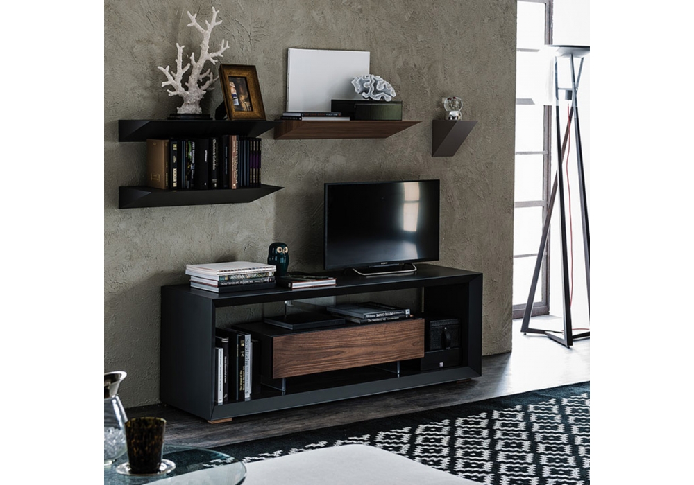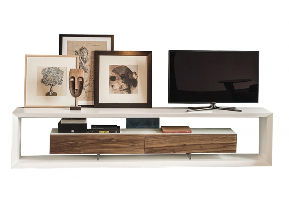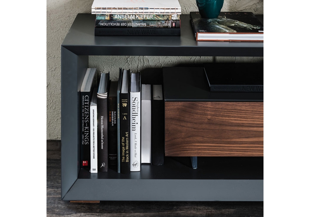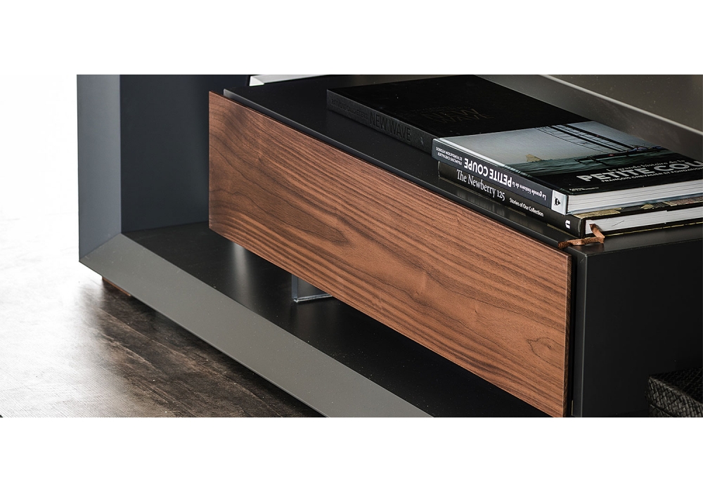 Boxer, von Paolo Cattelan für Cattelan Italia entworfen, ist ein TV-Ständer mit Struktur und Schubladenelement aus weiß oder graphit lackiertem Holz. Front in Canaletto Nussbaum.