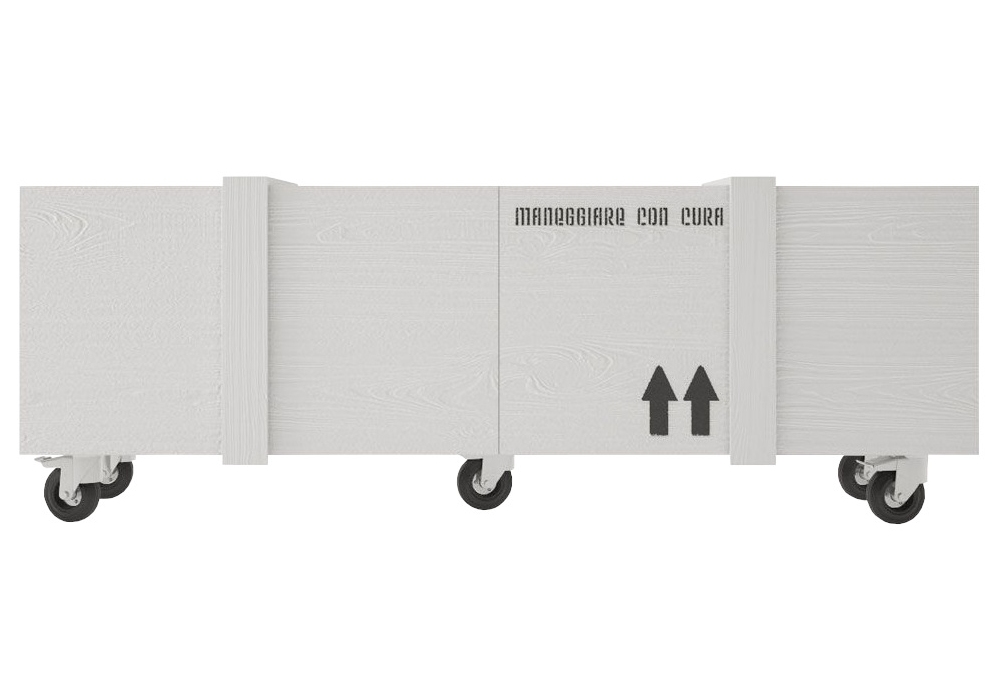 Fragile von Claudio Bitetti für Minotti Italia entworfen, ist ein Sideboard oder TV-Schrank aus Agglomeratholz bestehend aus vier Flügeltüren mit Griffen und Industrierädern (h 15 cm mit Bremse), mit zwei beweglichen Regalen im Inneren. Außenflächen in Lärchenholz gebürstet, geprägtes Finish in verschiedenen Farben erhältlich. Möglichkeit der Zugabe von Klebstoff.