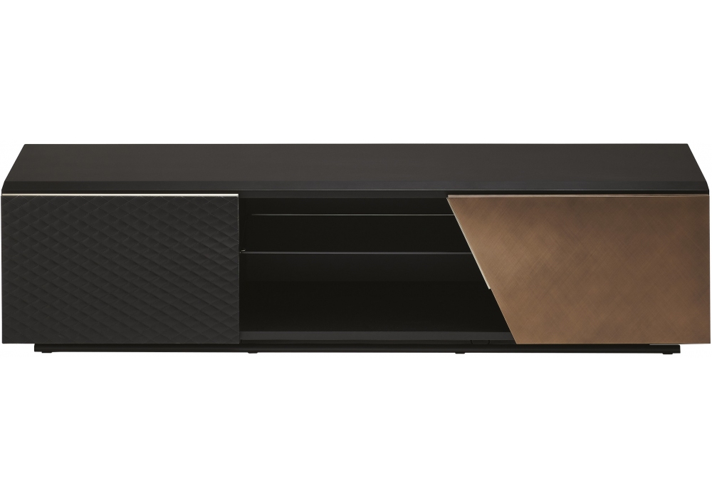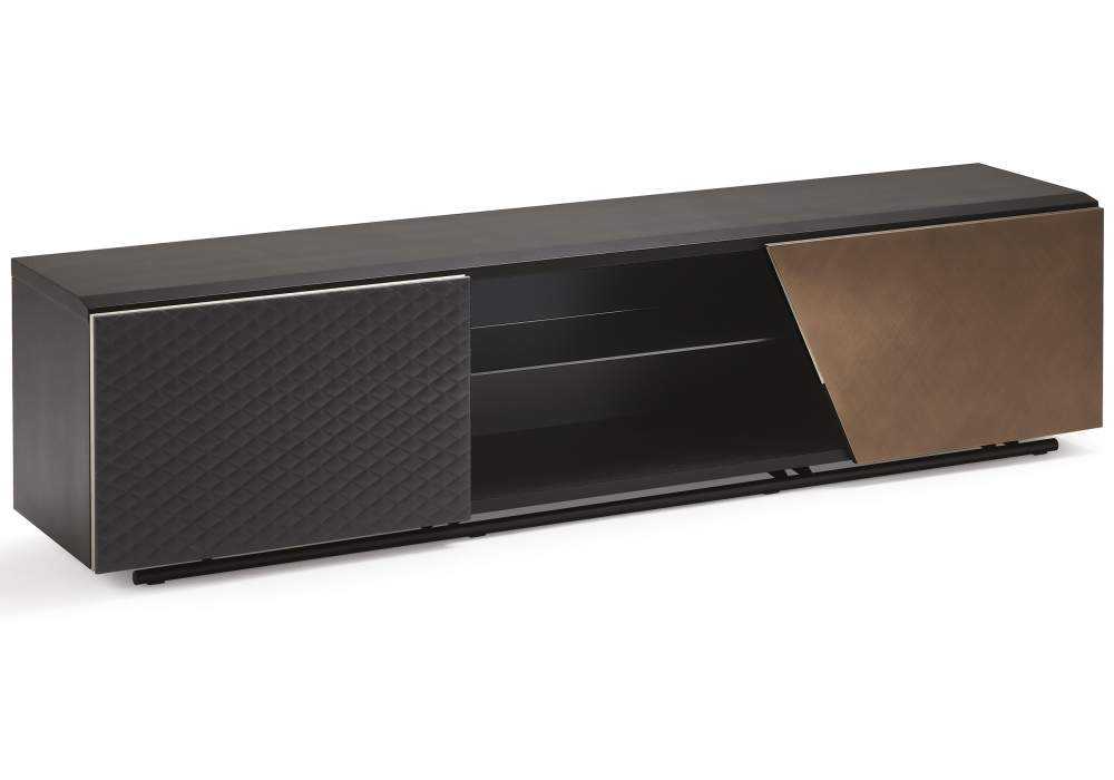 Aston TV, von STC Studio für Cattelan Italia entworfen, ist ein TV Träger mit geprägter lackierter Holzstruktur und Stahlgestell. Linke Tür mit Steppbezug in Leder oder Kunstleder und rechte Tür in Holz mit Details in Schwarzchrom. Innenregale aus Rauchglas.