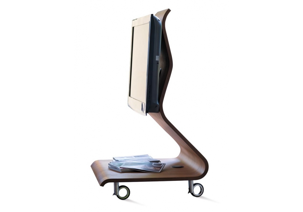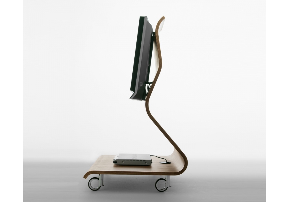 Cobra von Mario Bellini für Casamania & Horm entworfen, ist ein TV-Ständer aus mehrschichtiger Fromager-Holzstruktur (Ceiba Pentadra), furniert und gebeizt. Rückseitiger Kabelkanal mit Klettband abgedeckt in Holz furniert in der gleichen Ausführung wie das Gehäuse. Mitgeliefertes Kit zum Anschließen des Fernsehers (max. 35 kg). Mehrfachsteckdose und LED-Ambientelicht unter dem Sockel positioniert.