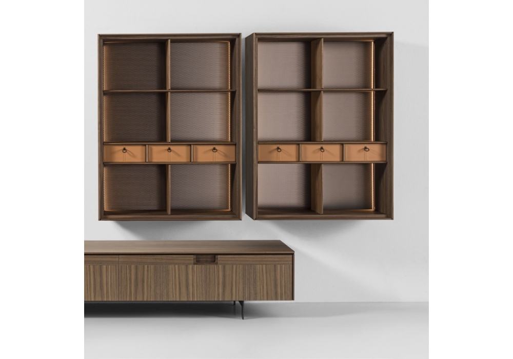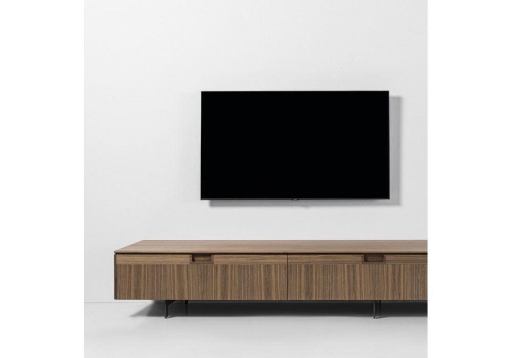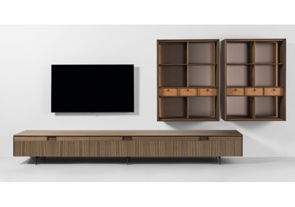 Matics TV von Gabriele & Oscar Buratti für Porada entworfen, ist ein modulares System, das mit einem TV-Schrank, Aufbewahrungselementen und Paneelen ausgestattet ist. Innenraum ausgestattet mit integrierter LED-Beleuchtung, dimmbar über Fernbedienung oder APP, Regale und offenes Fach, mit der Möglichkeit, max. drei Schubladen mit Holz- oder Cuoio-Fronten. Metallsockel in Zinnoptik und Platte aus Holz oder Marmor.