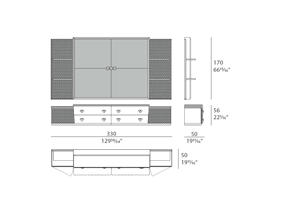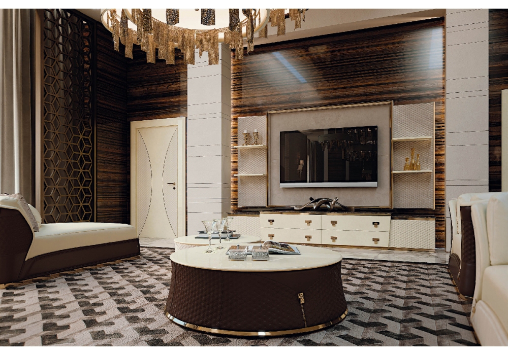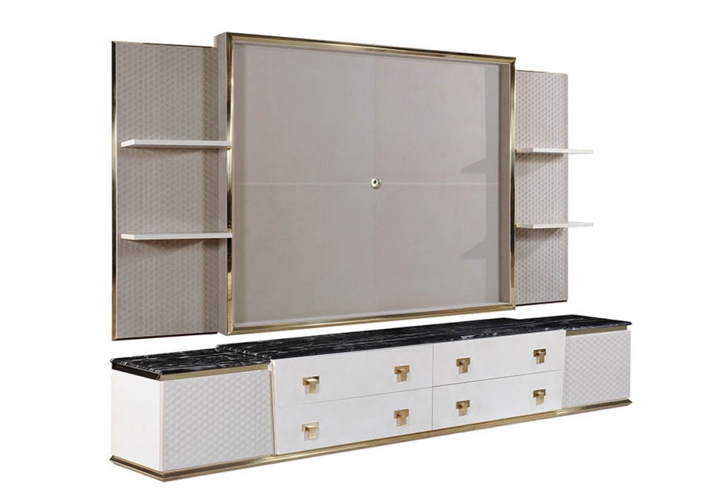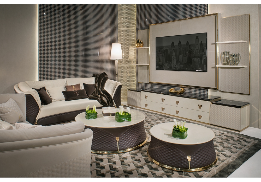 Vogue von Andrea Bonini für Turri entworfen, ist ein TV-Schrank mit Tafel mit Struktur aus MDF, Sperrholz und Spanplatten in glänzend lackierter Ausführung. Platte aus Marmor oder Holz. Mit Leder bezogene Türen, die außen mit einem sechseckigen Muster bestickt und innen glatt sind. Paneel mit Struktur aus glänzend lackiertem MDF und Bezug aus besticktem Leder.