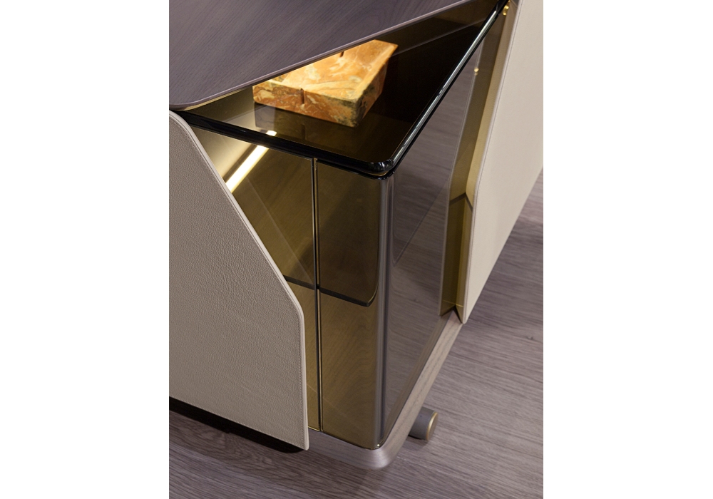 Vine von Frank Jiang für Turri entworfen, ist ein TV-Möbel mit einer Struktur aus MDF, Sperrholz, Massivholz und nussbaumfurnierten Spanplatten. Es gibt zwei bronzierte Glastüren mit Lederpolsterung und zwei Schubladen mit Mikrofaserfutter. Es gibt zwei Seitenfächer mit Türen, die beide mit einem bronzierten Glasboden und LED-Beleuchtung ausgestattet sind, sowie ein offenes Fach.