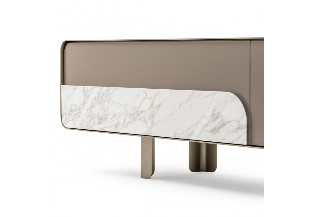 Soul von Giuseppe Viganò für Turri entworfen, ist ein TV-Möbel mit MDF-Struktur und glänzend lackierten Spanplatten. Metallteile in mattem Finish. Es gibt zwei Kommoden mit dekorativen Details in Nussbaum oder Marmor.