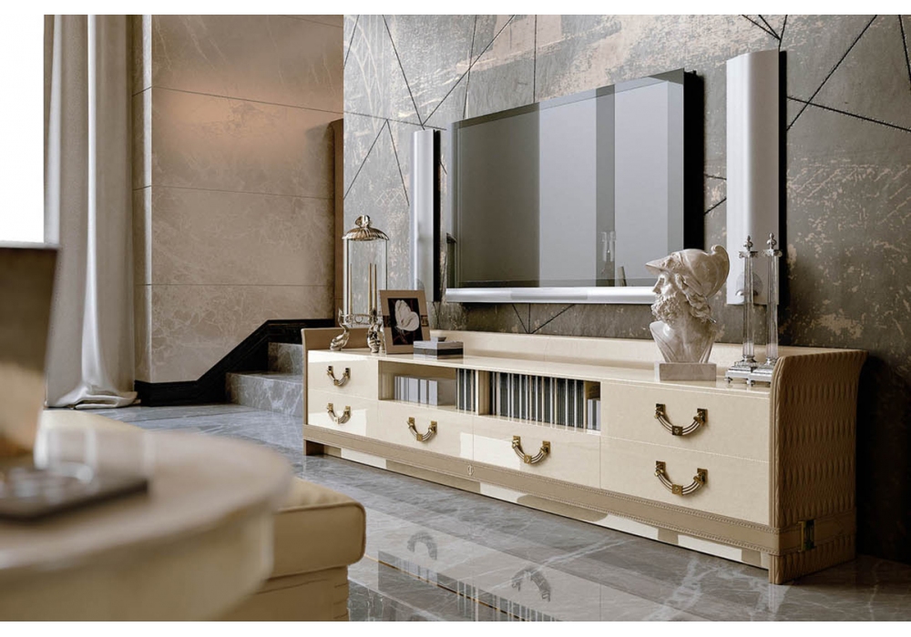 Numero Tre von Roberto Serio für Turri entworfen, ist ein TV-Möbel mit Struktur aus MDF, Massivholz, Sperrholz und Spanplatten in glänzend lackierter Ausführung mit vollständig oder teilweise mit besticktem Leder bezogener Rückseite. Die Platte ist in Marmor oder Holz erhältlich. Auf Wunsch können die Griffe entweder mit Leder oder mit Metall bezogen werden. Verfügbar in mehreren Abmessungen.