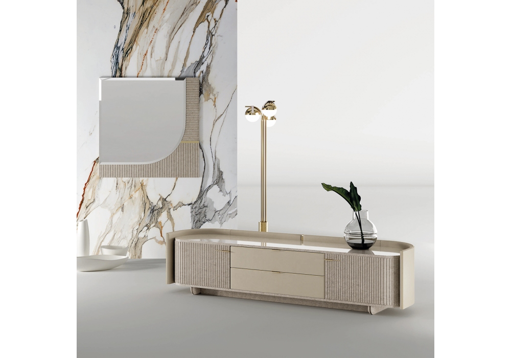 Eclipse, von Andrea Bonini für Turri entworfen, ist ein TV-Möbel mit Struktur aus MDF, Sperrholz und Spanplatten in glänzend lackierter Ausführung und mit Leder bezogener Schale. Es gibt zwei Holztüren mit dekorativen Lisenen und zwei lederbezogene Schubladen mit Innenausstattung aus Mikrofaser. Metallteile in hellgoldenem Finish. Verfügbar in mehreren Größen. Auf Anfrage ist es für die Größe 330 x 54 x H 56 möglich, ein TV-Panel hinzuzufügen.