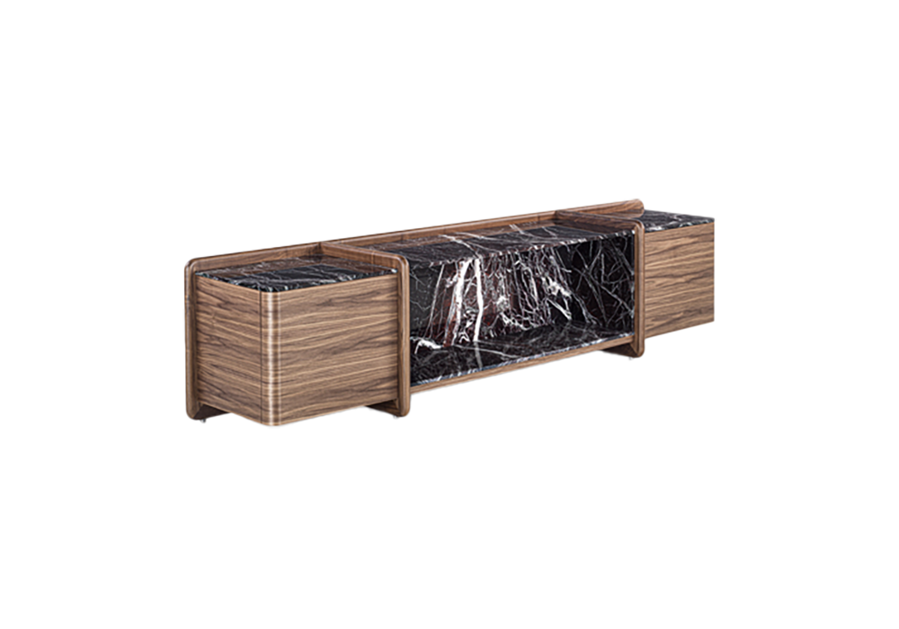 Akeru TV von Giuseppe Viganò für Porada entworfen, ist ein TV-Ständer mit Struktur aus Canaletta-Nussbaumholz in verschiedenen Ausführungen und Metallfüßen in Zinnoptik. Offenes Fach in der Mitte aus Holz oder Marmor in der gleichen Farbe. Seitentüren mit Push-Pull-Öffnung und versenktem Griff, Holzfronten und Glasböden im Inneren. Die Oberseite verfügt über eine Kabelöffnung für den Zugang zum unteren Fach. Offenes Fach mit doppeltem Boden für die Kabeldurchführung. Abnehmbare Rückwand. Ebenfalls erhältlich ist der Akeru Box Container aus extraklarem Glas.