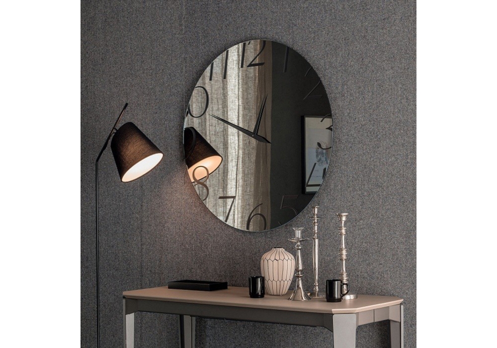 Moment, von Brogliato & Traverso für Cattelan Italia entworfen, ist einer Spiegel/Uhr aus verspiegeltem oder geräuchertem Spiegelglas mit Lanzetten in schwarzem Aluminium. Verfügbar in einer quadratischen oder runden Version.
