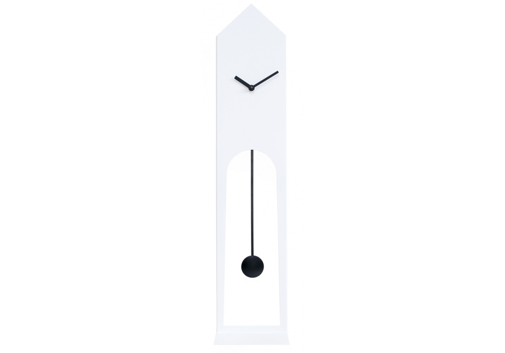 Don von Francesco Paolo Maria Giuliani für Progetti entworfen, ist eine Pendeluhr aus weißem oder schwarzem Stahl. Im unteren Teil befindet sich ein Stützboden. Es ist mit ungiftigen Farben gefärbt und verwendet ein in Deutschland hergestelltes batteriebetriebenes Uhrwerk. Verfügbar in mehreren Modellen.