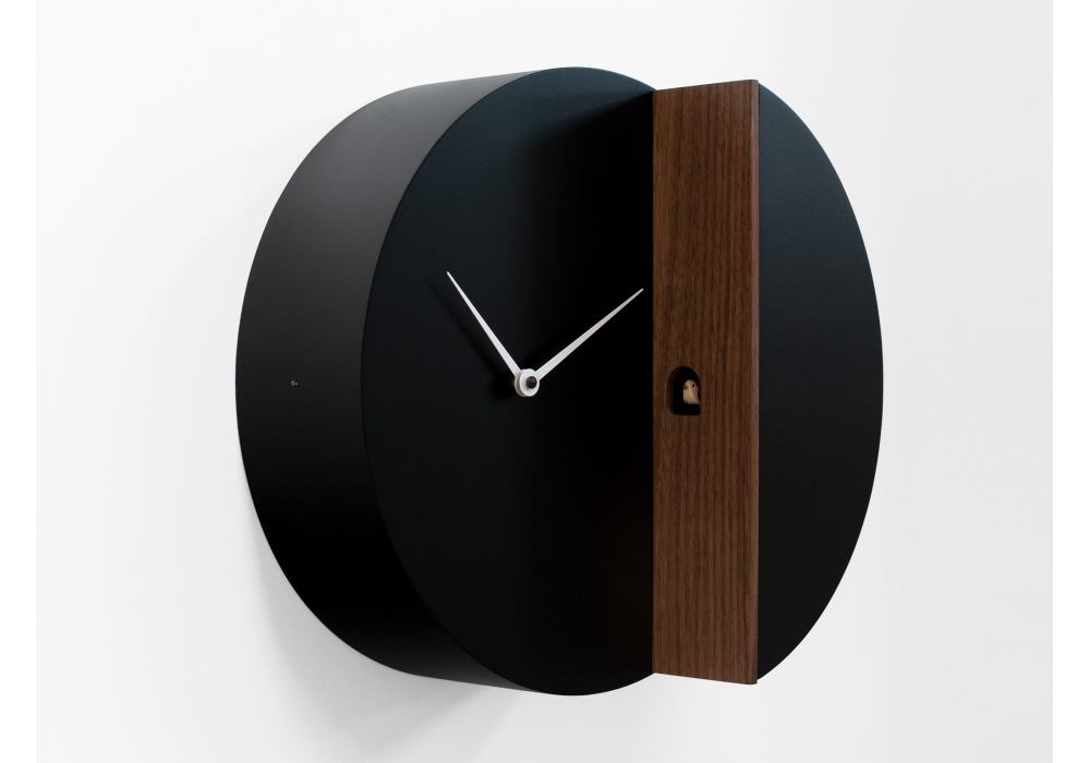 Peek-a-koo von Krit Jiratkaruen für Progetti entworfen, ist eine Wandkuckucksuhr aus Holz und recycelbarem Kunststoff mit Einsatz aus massivem Walnussholz. Mit ungiftigen Farben bemalt. Das Kuckuckswerk, deutsches Design, ist von hoher Qualität und wird mit zwei Batterien betrieben, hat einen lichtempfindlichen Sensor, der es nicht zum Singen bringt, wenn es dunkel ist. Mit einem Druckknopf können Sie die Intensität des Tons regulieren oder ganz ausschalten.