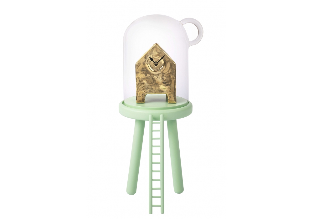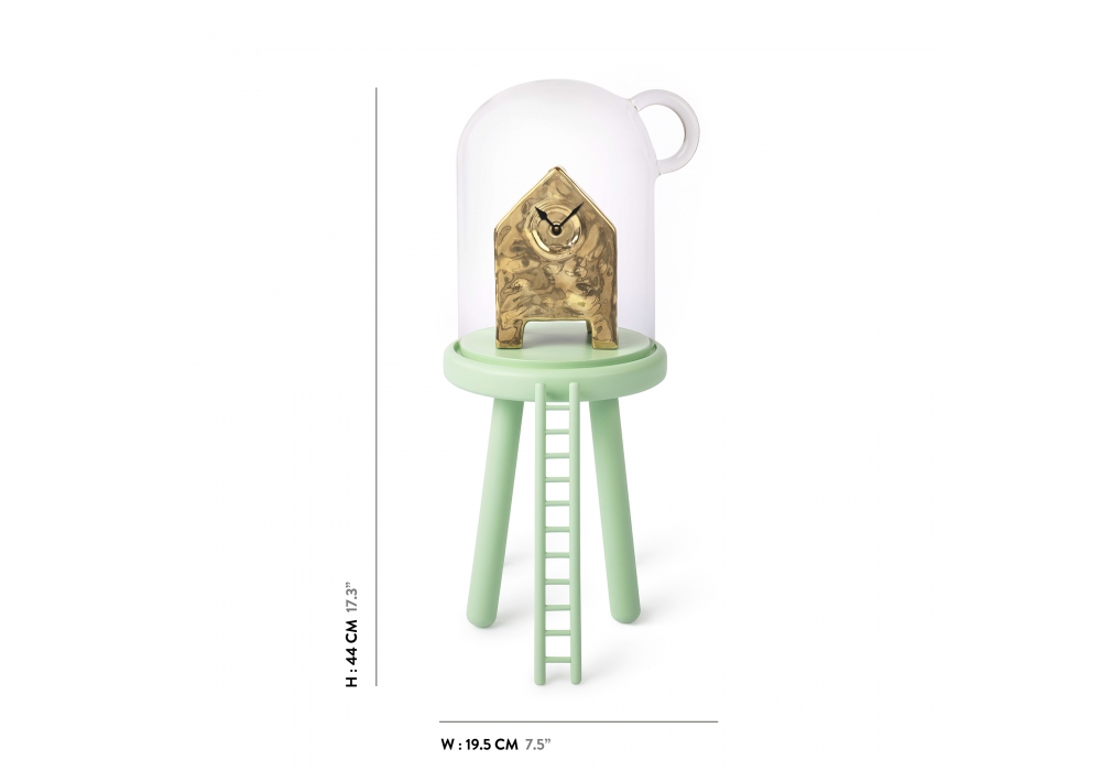 La Fabrique Des Rêves N°3 von Kiki van Eijk für Maison Dada entworfen, ist eine Uhr, die durch eine Glocke aus mundgeblasenem Glas auf einem zederngrün lackierten Massivholzsockel strukturiert ist. Die Uhr ist aus goldfarbener emaillierter Keramik.