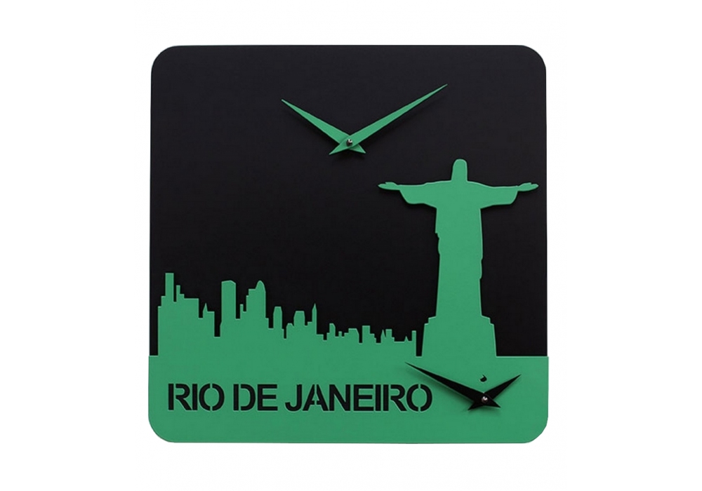 Time Travel Rio De Janeiro hat Gianluca Minchillo für Progetti entworfen und ist eine Wanduhr aus schwarz lackiertem Holz und grünem Metall. Zwei batteriebetriebene Quarzwerke.