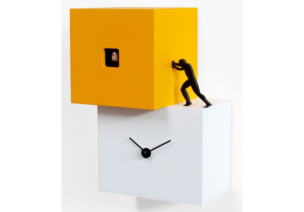 Strong Cucù 1 von Antonio Farina für Progetti entworfen, ist eine Wand- oder Tischkuckucksuhr aus lackiertem Holz und Stahlzeigern. . Batteriebetriebenes Quarzwerk. Ein lichtempfindlicher Sensor stoppt den Klingelton automatisch, wenn kein Licht vorhanden ist.