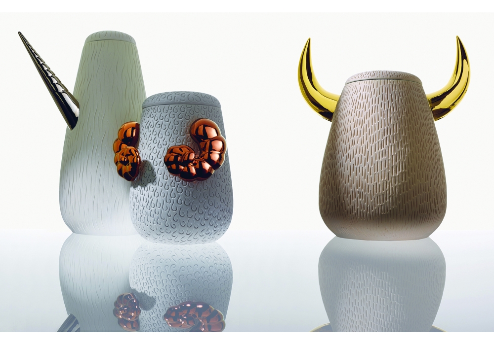 Animalità Toro, von Sam Baron für Bosa entworfen, ist einer Container in Keramik angereichert mit farbigen Glasuren und Edelmetallen. Die Animalità-Kollektion repräsentiert fantastische Tiere und beinhaltet spielerische und animistische Objekte, deren zentrales Thema ist im übertragenen Sinne interpretiert, wörtliche und experimentelle.