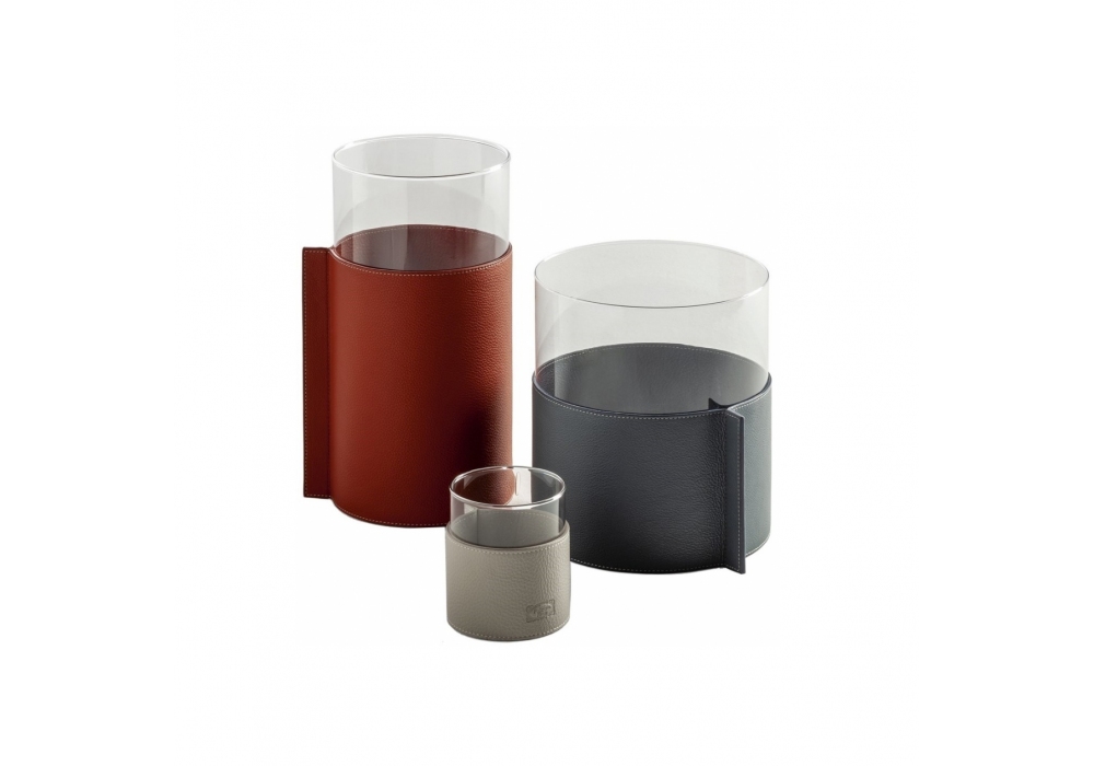 Leather Pot entworfen von Simona Cremascoli für Poltrona Frau ist eine Vase aus Glas mit einer Abdeckung in Pelle Frau Nest oder SC. Erhältlich in drei Größen.