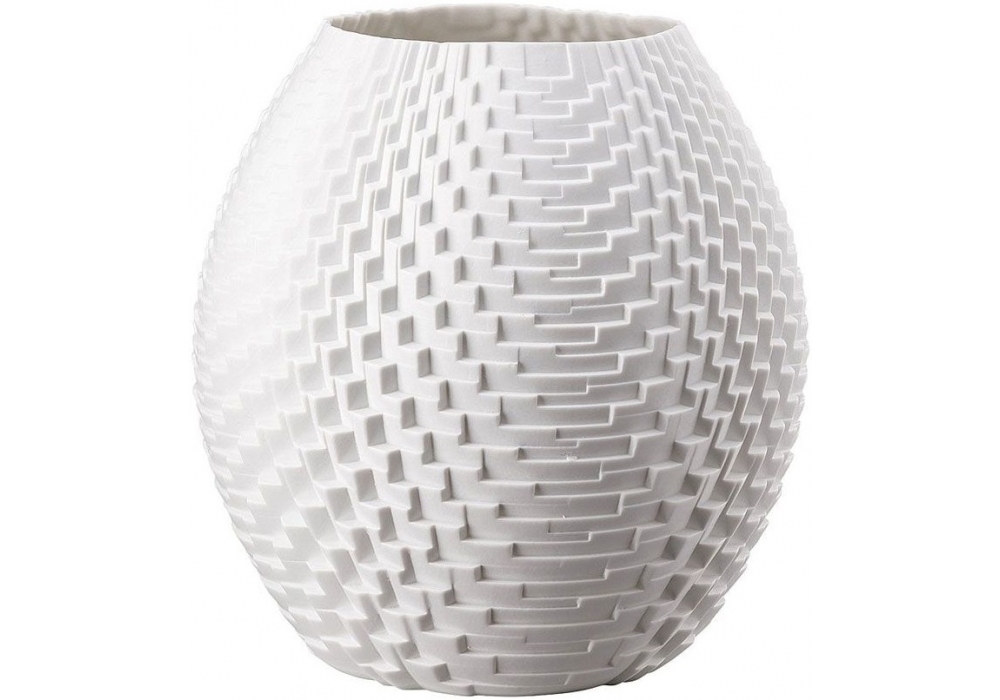 Phi Manhattan von Cairn Young für Rosenthal entworfen, ist eine weiße Porzellanvase mit Dekorationen.