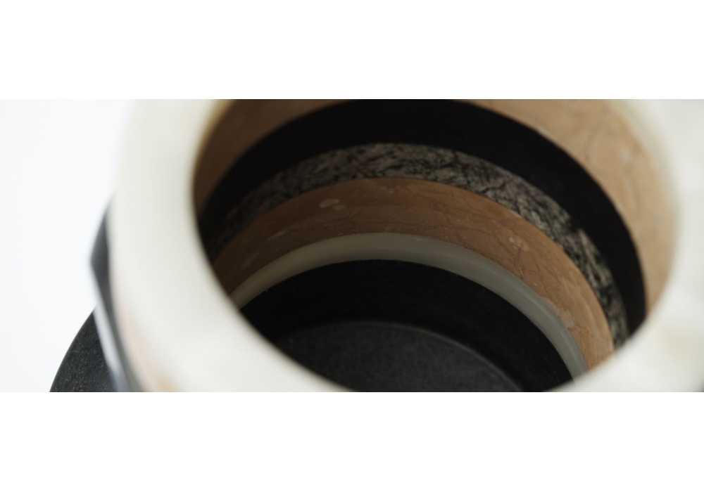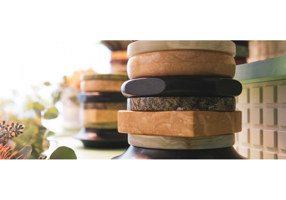 Anna von Cristina Celestino für Budri entworfen, ist eine Vase bestehend aus Armreifen in verschiedenen Farben und Formen, hergestellt in Nero Assoluto, Onice Verde, Rain Forest Green und Giallo Noce.