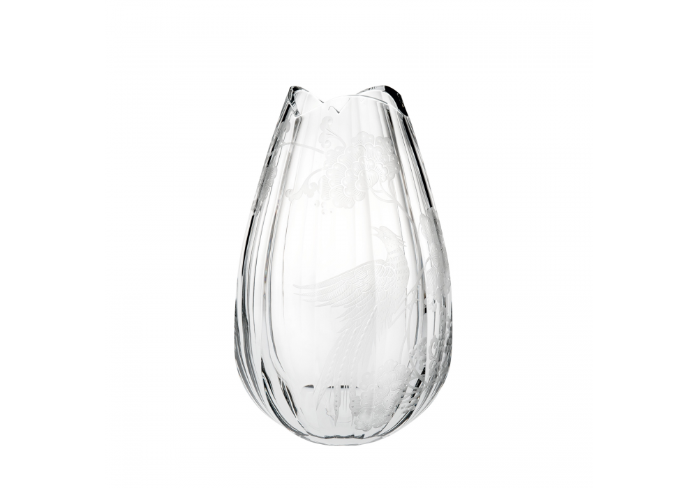 Blue Bird von Vista Alegre entworfen, ist eine Gravierte Vase aus handgefertigtem Glas. Die Kollektion Blue Bird stellt einen Vogel dar, der über Blumen fliegt.