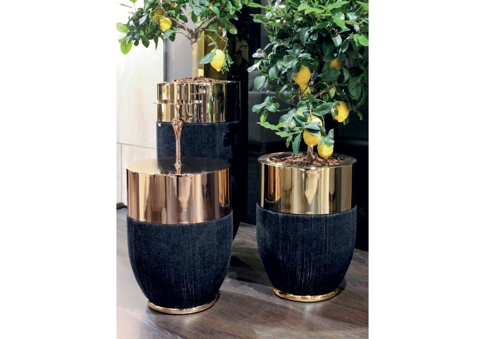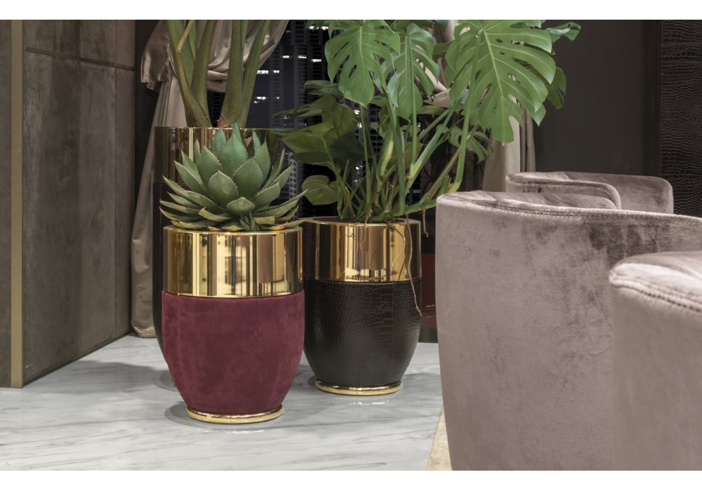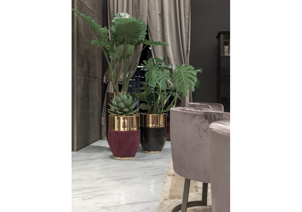 Godwin von Giuseppe Iasparra für Longhi entworfen, ist ein Übertopf mit einer Struktur aus Glasfaser, die mit Leder oder Stoff bezogen ist. Ober- und Unterteil aus glänzendem oder mattem Metall. Verfügbar in verschiedenen Ausführungen.