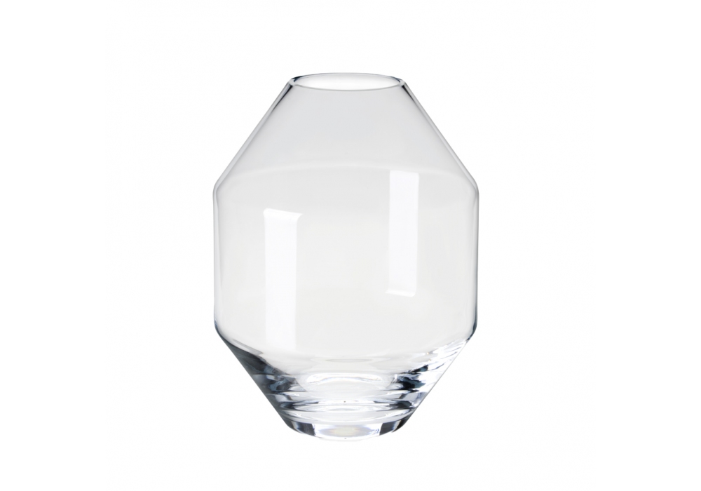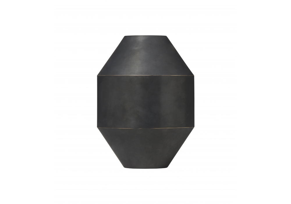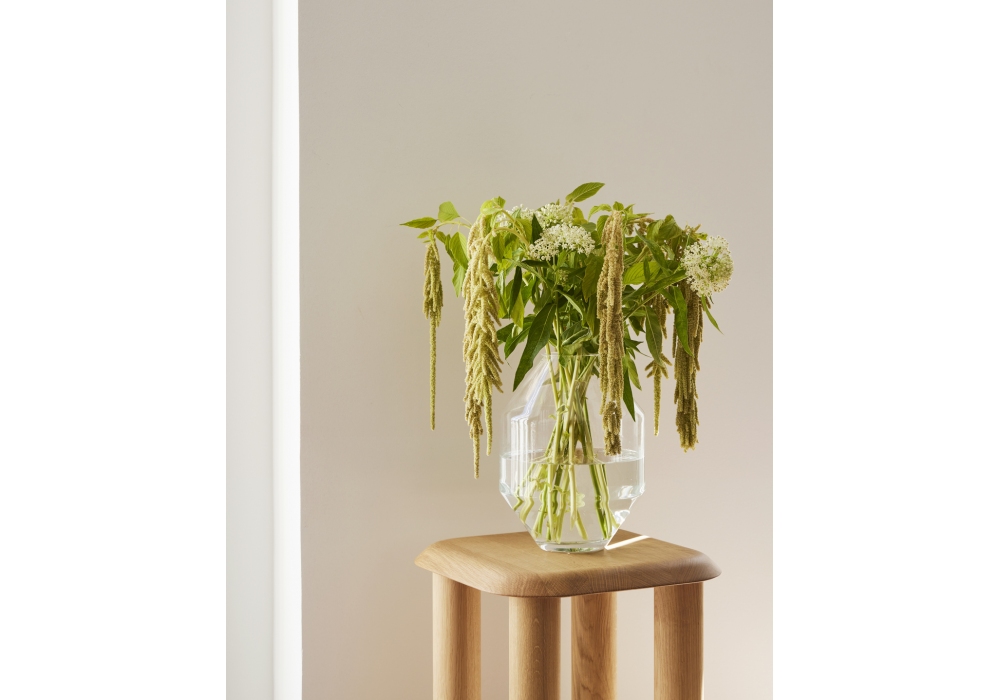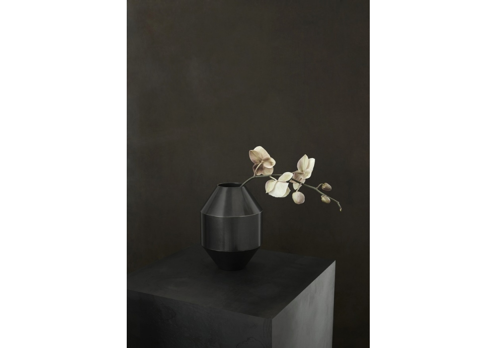Hydro, entworfen von Sofie Østerby für Fredericia, ist eine Vase aus Messingguss mit schwarz oxidierter Oberflächenbehandlung oder aus mundgeblasenem bleifreiem Kristallglas mit Scherenschliff. Erhältlich in zwei Größen.