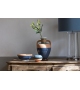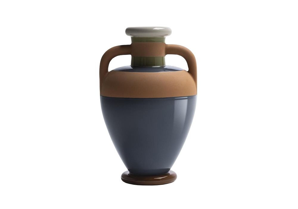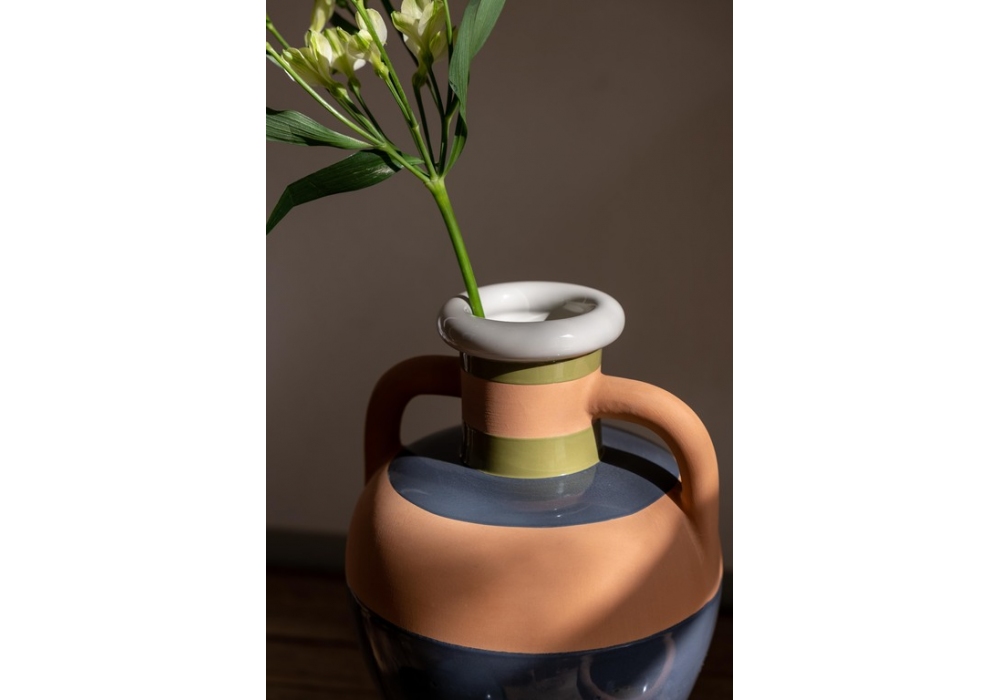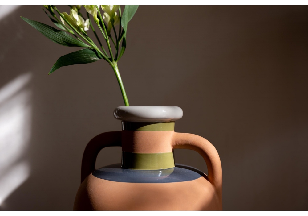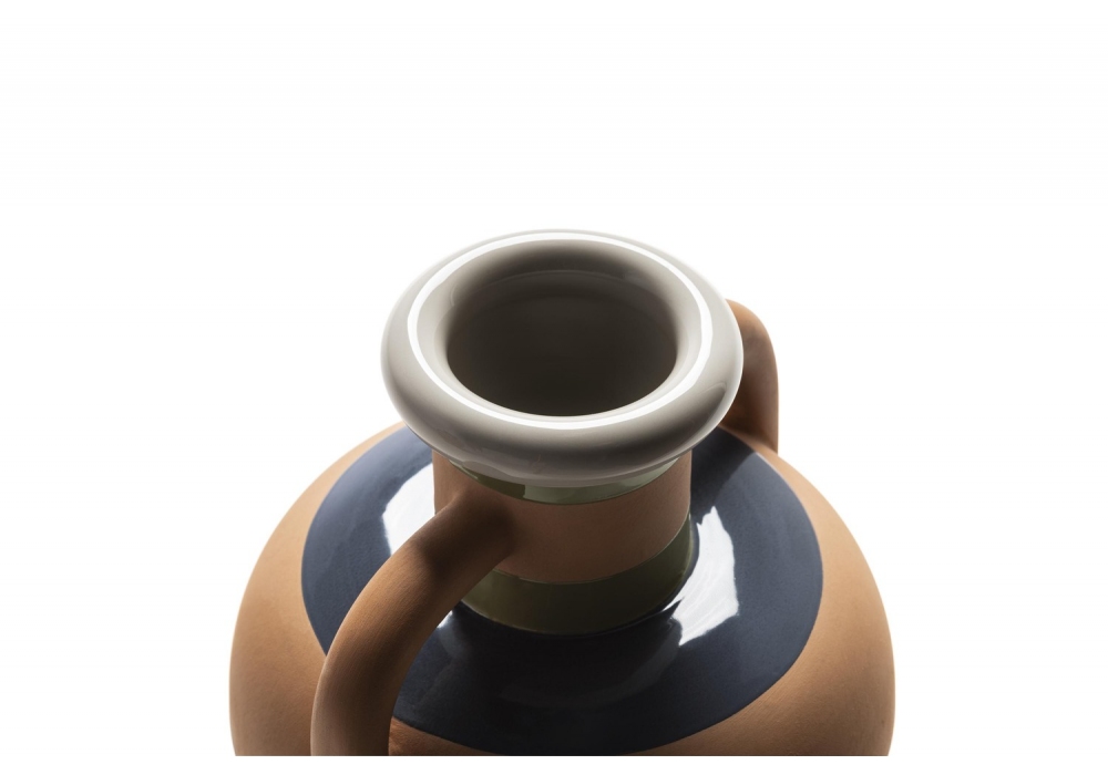 Ikiperu, entworfen von Kristine Five Melvær für Poltrona Frayu, ist eine handbemalte Keramikvase. Es besteht aus horizontalen Bändern, deren Oberflächen farbig glasierte Keramik und unglasierte Keramik kombinieren. Die Ikiperu-Vase ist in zwei Farbkombinationen erhältlich, inspiriert von den Ledertönen von Pelle Frau®.