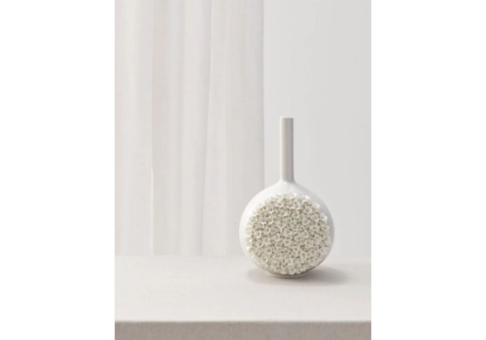 Flowers Tapestry signiert von Bodo Sperlein und modelliert von Dept. Diseño y Decoración für Lladró ist eine Vase aus Porzellan mit einem glänzend weißen Finish und kleinen Blumen, alles handgefertigt von Lladró-Künstlern.