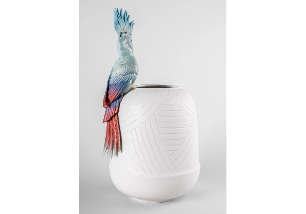 Cockatoo von José Santaeulalia für Lladró entworfen, ist eine weiße Porzellanvase mit geometrischen Mustern und verziert mit einem dreidimensionalen Kakadu in Blau- und Rottönen.