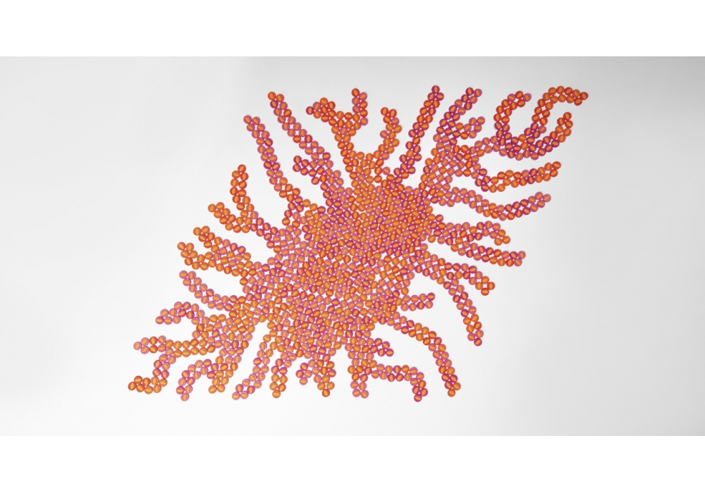 Metamorphosis Morpho, von Campana für Paola Lenti entworfen, ist eine Wanddekoration, die durch die Vereinigung von runden Elementen entsteht, auf die eine ovale Applikation genäht wird. Diese Elemente bestehen aus einer oberen Schicht aus Brio-Stoff und einer unteren Schicht aus synthetischem Filz, die miteinander verbunden und mit Kammstich eingefasst sind. Die Elemente werden dann zusammengefügt, um die Oberfläche des Wandteppichs zu bilden, der somit jede beliebige Form und Größe annehmen kann. Erhältlich in verschiedenen Farbkombinationen.