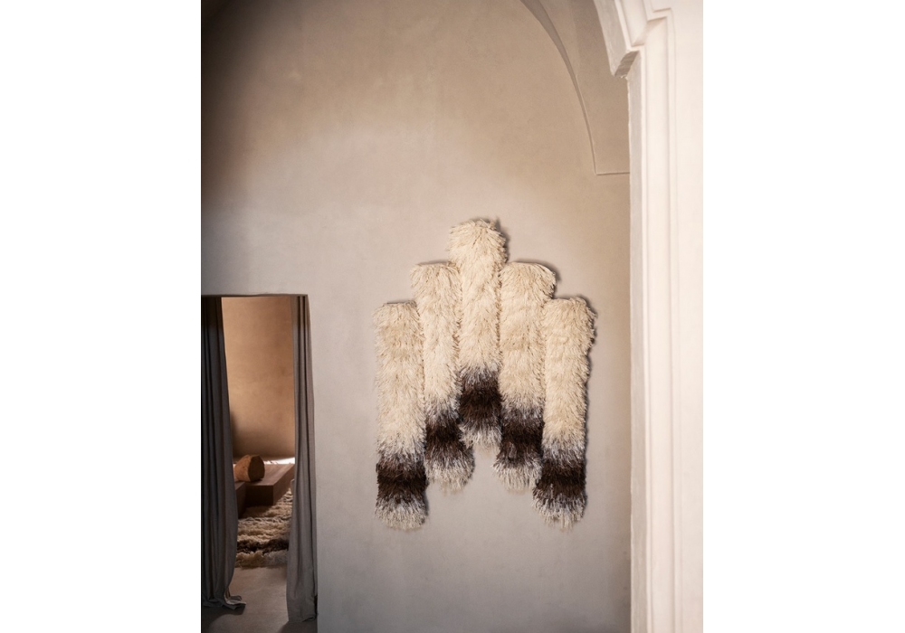 Leise von Salem van der Swaagh für Tacchini entworfen, ist eine Wanddekoration aus Naturwolle mit handgewebten und geknoteten Fäden.