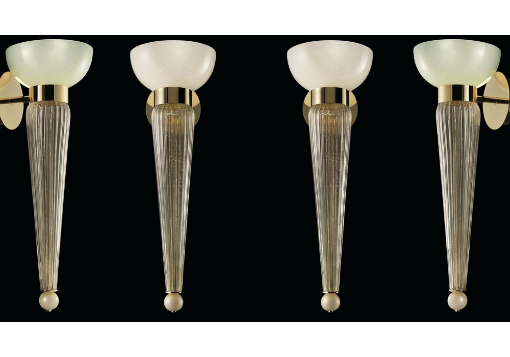 Torvik entworfen und hergestellt von Barovier & Toso ist eine Wandleuchte mit tragender Struktur und Details aus verzinktem goldfarbenem Metall oder gebürstetem Messing. Der Lampenkörper ist mit goldfarbenem venezianischem Glas überzogen und verfügt über einen becherförmigen Diffusor, der eine dimmbare LED- oder Halogenlichtquelle abschirmt. Torvik ist in verschiedenen Ausführungen erhältlich.