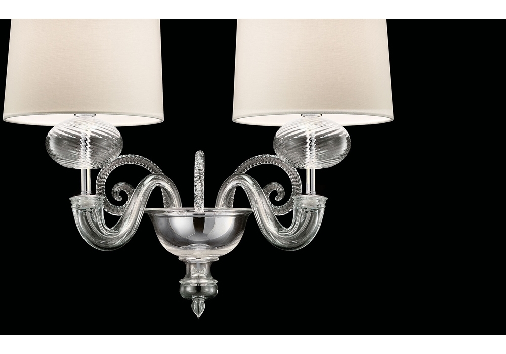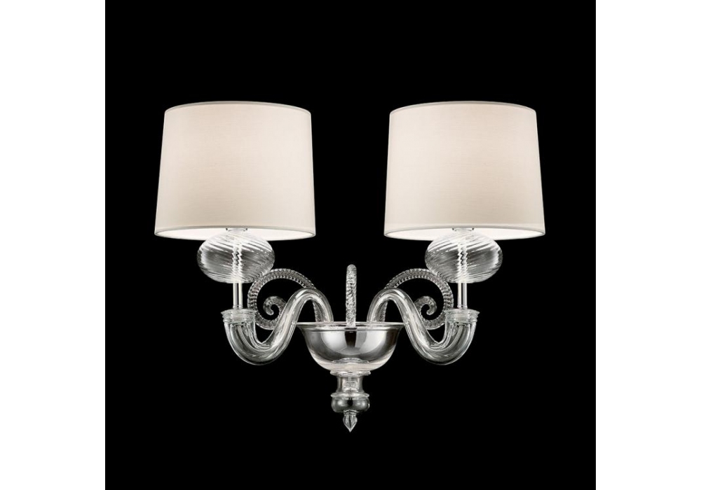 Tangeri hergestellt und entworfen von Barovier & Toso ist eine Wandleuchte mit einer tragenden Struktur mit zwei Metallarmen, die mit venezianischem Glas bedeckt sind. Die Lampenschirme sind rund aus Stoff und schirmen dimmbare LED oder Halogenlichtquellen ab. Tangeri ist in verschiedenen Ausführungen erhältlich.
