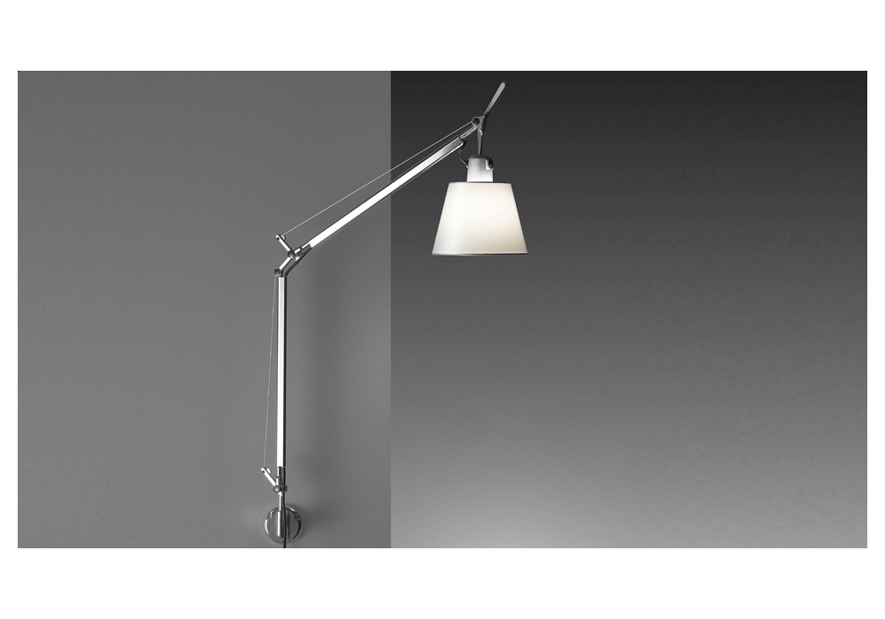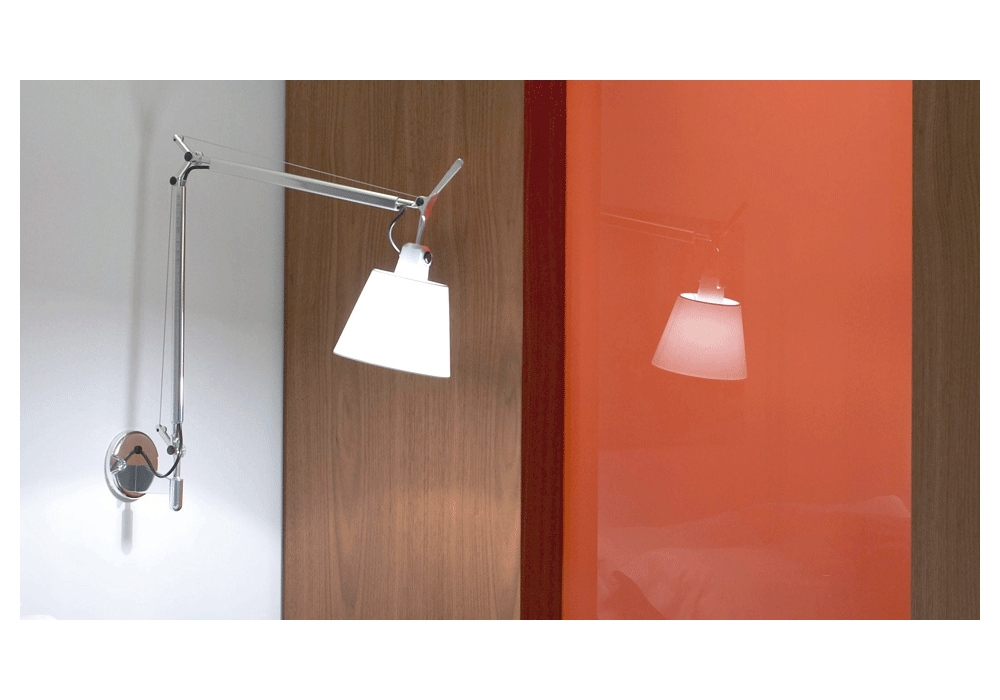 Tolomeo Basculante entworfen von Michele De Lucchi und Giancarlo Fassina für Artemide ist eine Wandleuchte die vollständig aus Aluminium gefertigt ist. Die Struktur verfügt über bewegliche Arme mit Gelenken und Stützen aus poliertem Aluminium. Der Lampenschirm ist kreisförmig und verfügt über eine LED-Lichtquelle. Tolomeo Basculante ist in verschiedenen Lampenschirmausführungen erhältlich.