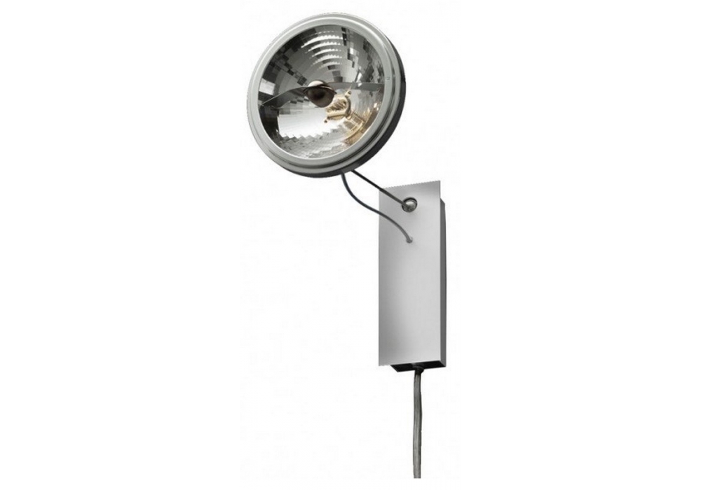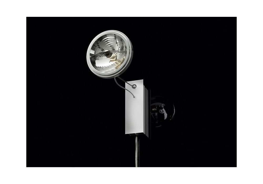 Use Me W., entworfen und hergestellt von Ingo Maurer, ist eine Wandleuchte mit Struktur aus Edelstahl und Aluminium. Der Strahler ist über zwei Kugelgelenke verstellbar.