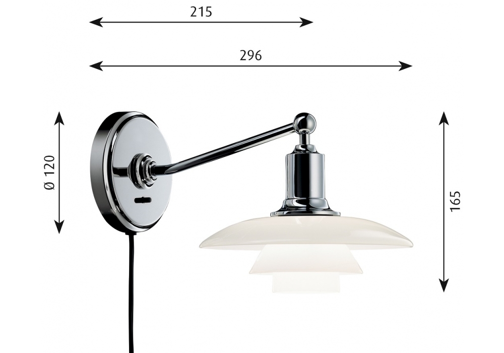 PH 2/1 von Poul Henningsen für Louis Poulsen entworfen, ist eine Wandleuchte mit tragender Struktur aus Messing und gesponnenem und verchromtem Aluminium. Der Diffusor ist aus opalweißem Glas und schirmt eine Lichtquelle mit E14-Fassung vom Typ LED oder Halogen mit verschiedenen Steuerungsmöglichkeiten ab.