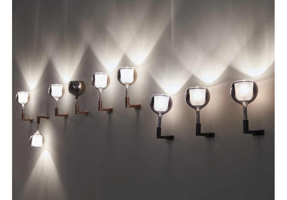 Glo von Carlo Colombo für Penta entworfen ist eine Wandleuchte mit Struktur aus lackiertem Metall. Der Diffusor ist becherförmig aus Borosilikatglas und nimmt eine LED-Lichtquelle auf. Glo ist in verschiedenen Größen und Ausführungen erhältlich.