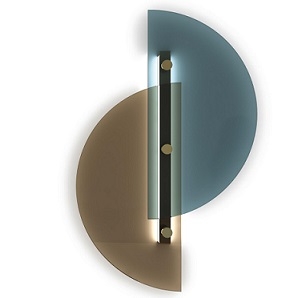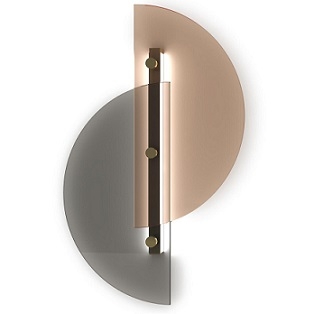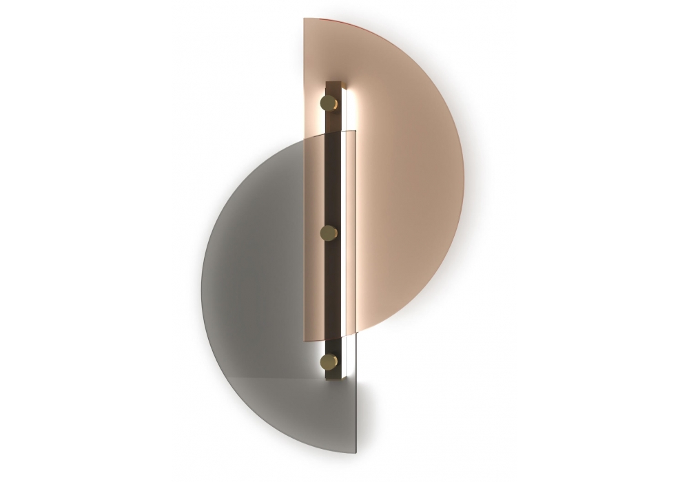 Papillon von Bernhardt & Vella für Arflex, ist eine LED-Wandleuchte aus zwei gehärteten und laminierten Gläsern. Struktur aus goldenem Metall. Verfügbar in zwei vordefinierten Farbkombinationen: Rosa und Grau oder Hellblau und Bronze.
