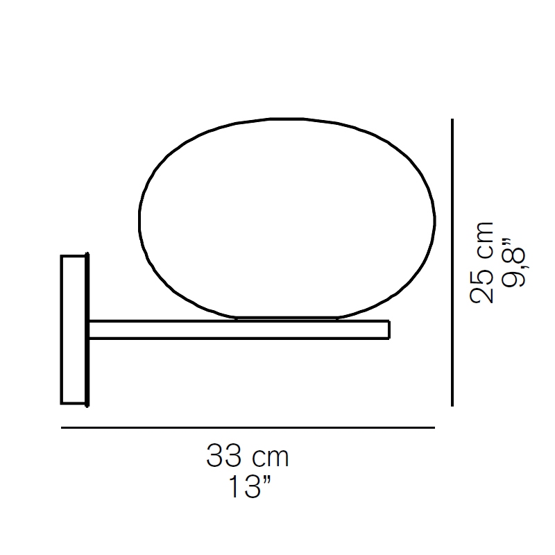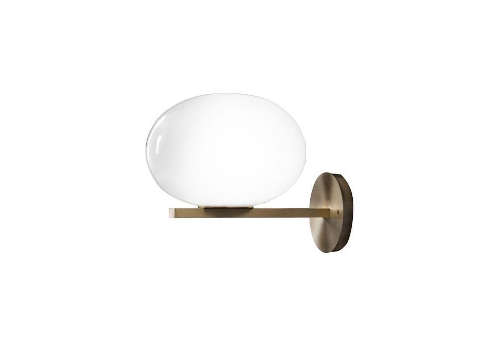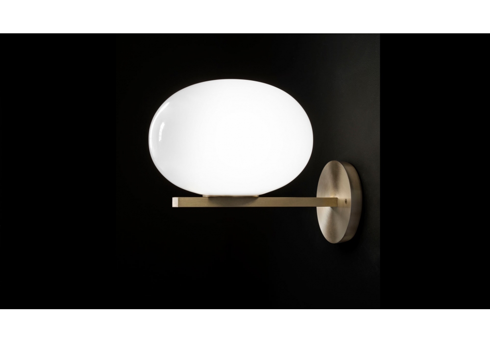 Alba von Mariana Pellegrino Soto für Oluce entworfen ist eine Decken-/Wandleuchte mit tragender Struktur aus satiniertem messingfarbenem Metall. Der Diffusor hat eine ellipsenförmige Form aus glänzendem, opalgeblasenem Glas und schirmt eine Lichtquelle. Alba ist in verschiedenen Modellen erhältlich.